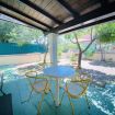 All'esterno vi è una veranda arredata con tavolo e sedie e il giardino con doccia esterna e aria barbecue per consumare i pasti durante le ore di fresco serale e trascorrere i vostri momenti in totale relax.